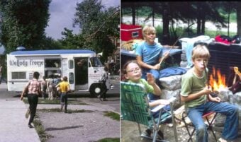 • A black-and-white photo collage: Left, a group of friends laugh and socialize at a diner. Right, a boy gleefully hugs an open fire hydrant spraying water on a city street.