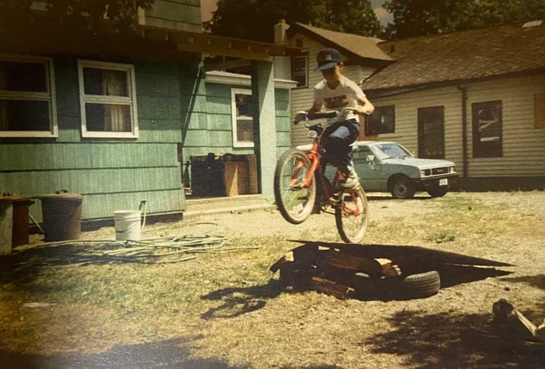 You didn’t need a fancy skate park to practice your bike tricks — just a couple of tires and a wooden board.