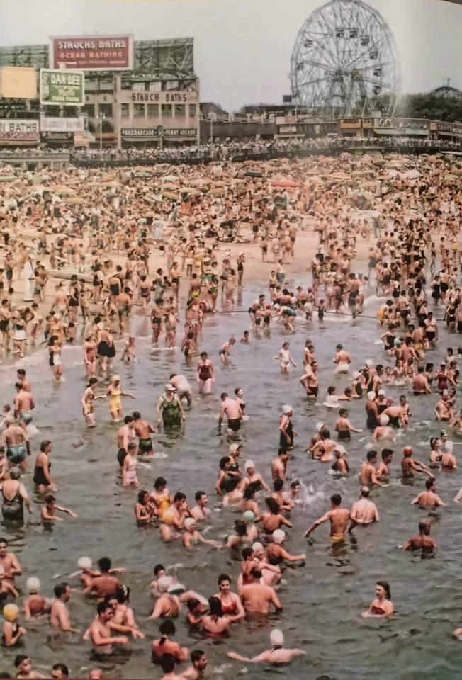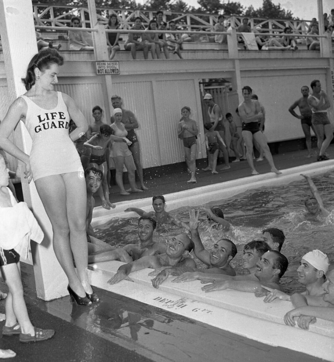 5. Men Flocking to the Lifeguard at Steeplechase Pool (1942)