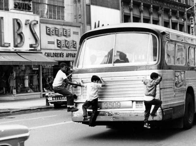 11. Hitchhiking on Steroids: Boys Catch a Free Ride on the Back of a City Bus in New York City, 1970