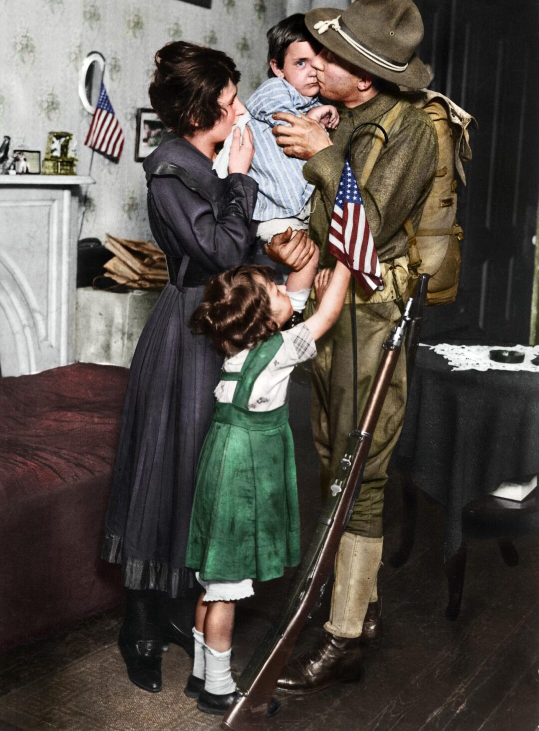 10. Colorized Image of a Soldier Returning Home to His Family After WWI, 1917